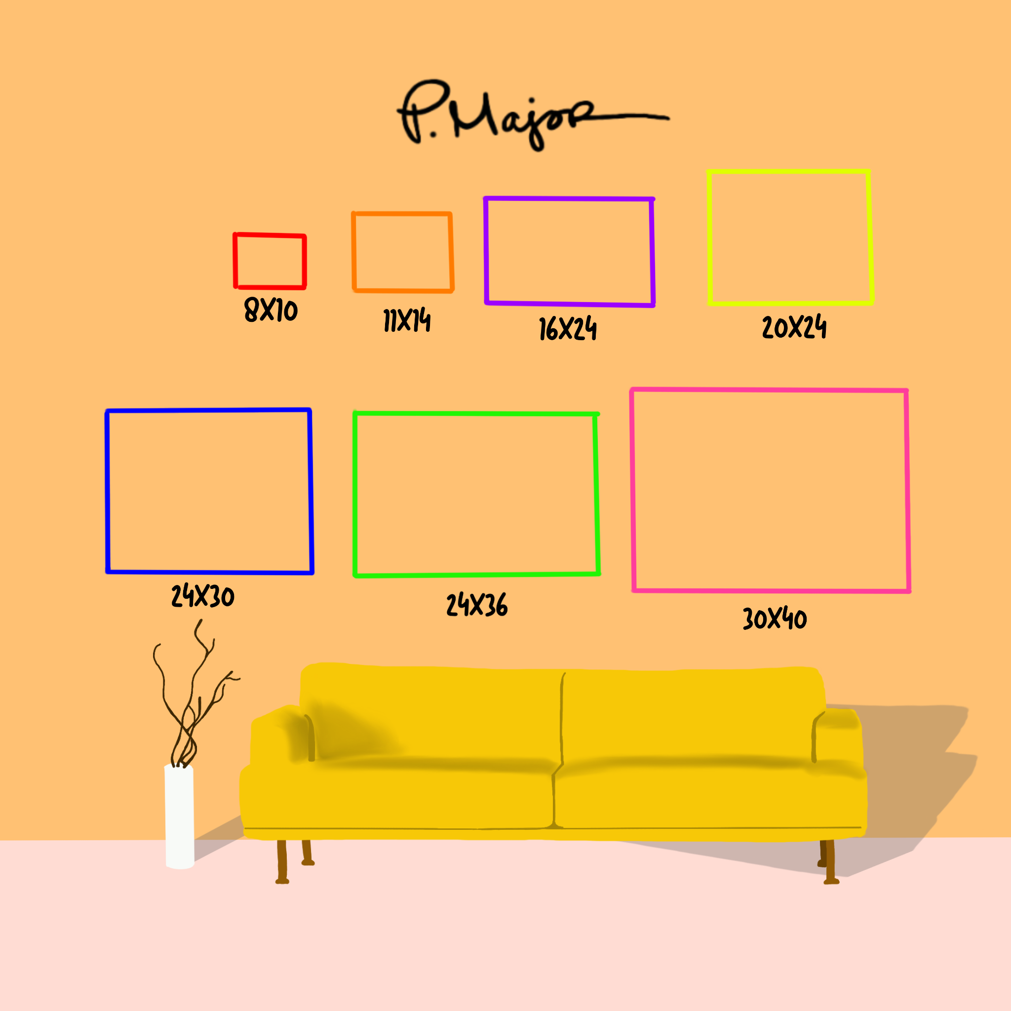 1) The dimensions or canvas size desired. (See size chart for paintings below.)
